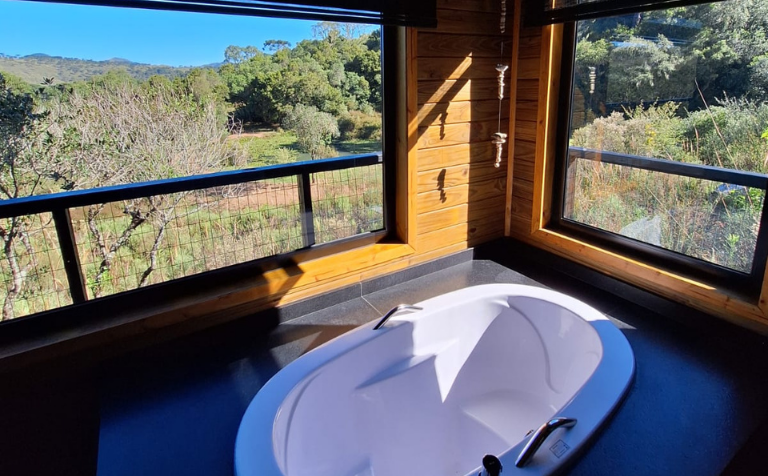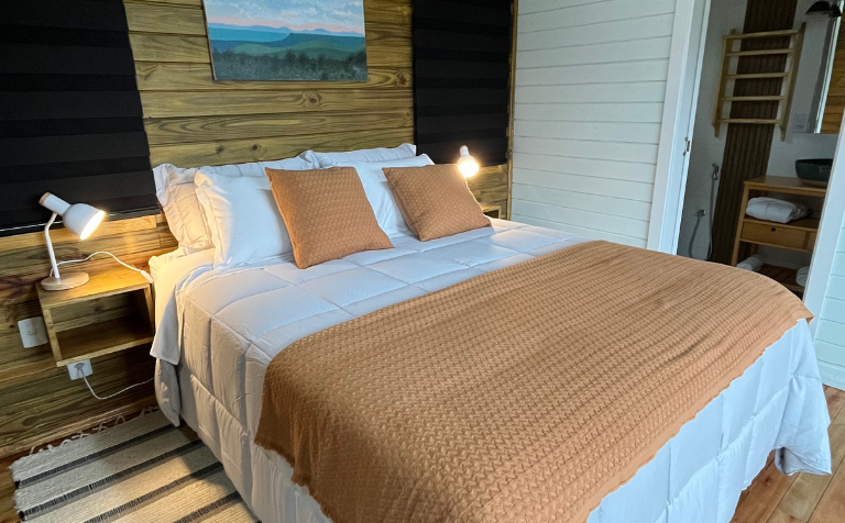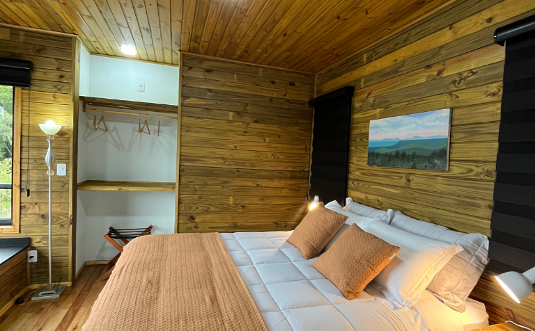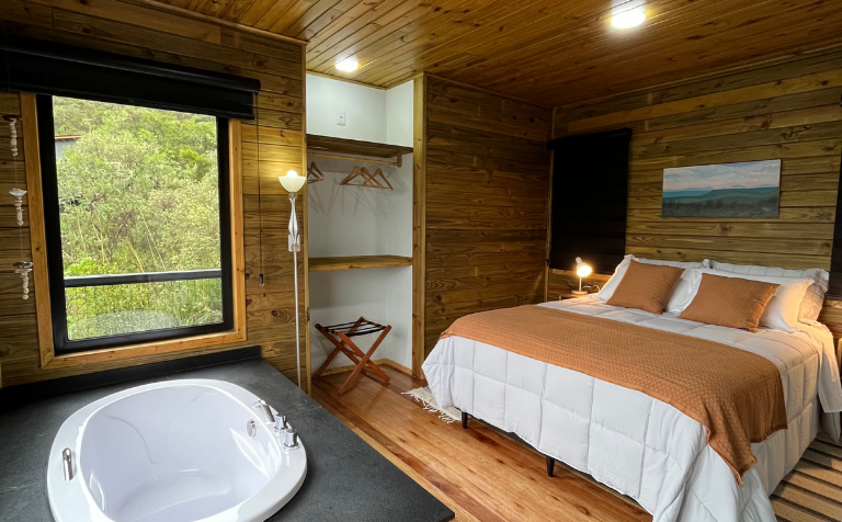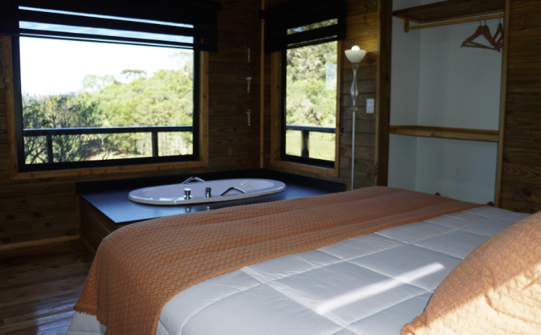 - Quarto com 16m² com cama de casal e ofurô com ampla vista para o lago e os bosques.