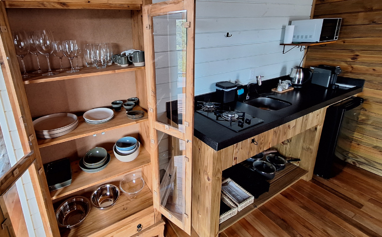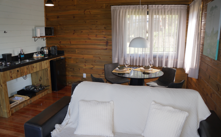 - Sala-cozinha conjugada com 21 m² com todas as instalações e materiais para seu bem-estar: frigobar, fogão, panelas, louças, talheres e cristais.