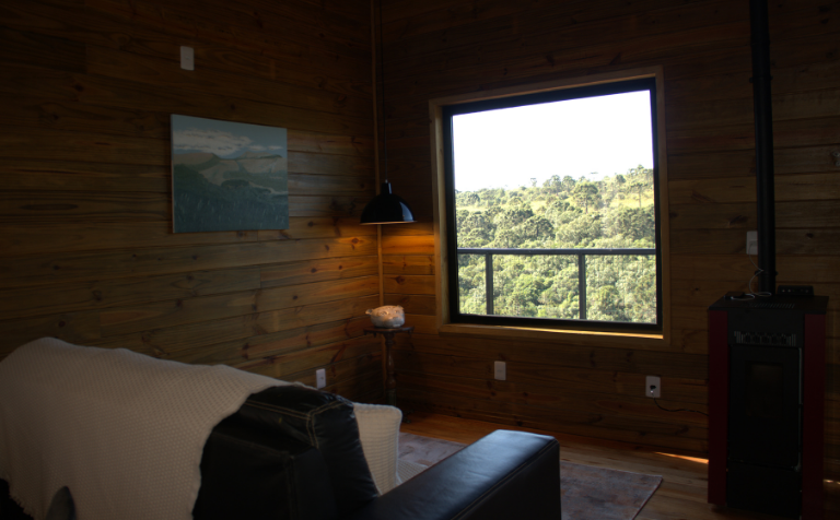 - Sofá de três lugares em frente a ampla janela com vista para o exterior (opção para terceiro hóspede).