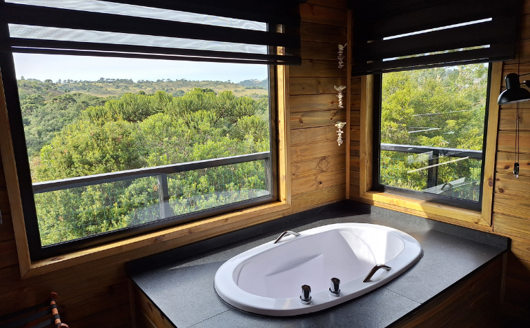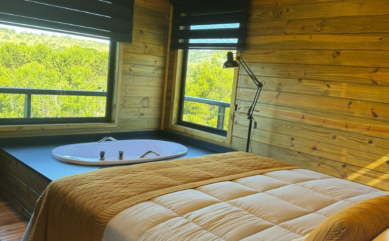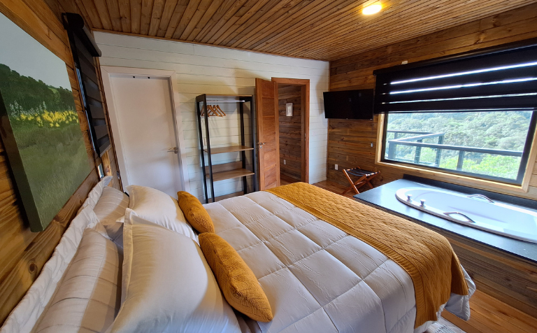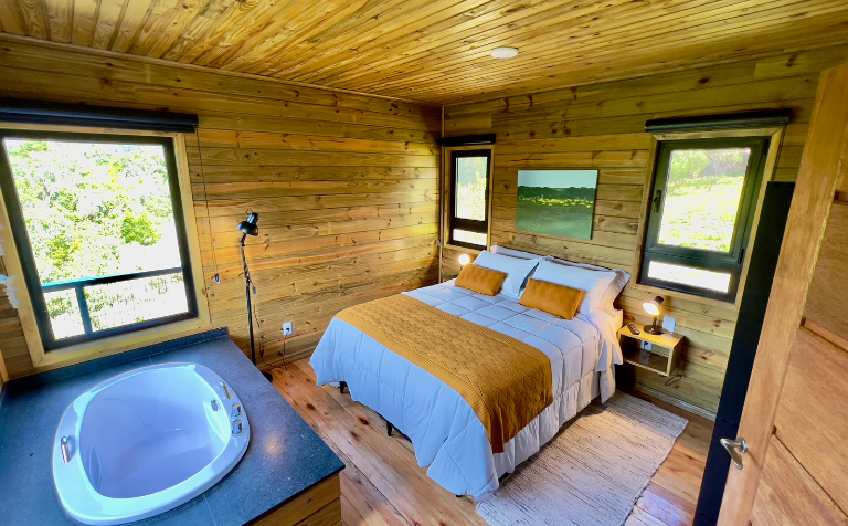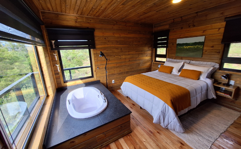 - Quarto com 15 m² com cama de casal e ofurô com ampla vista para o lago e os bosques.