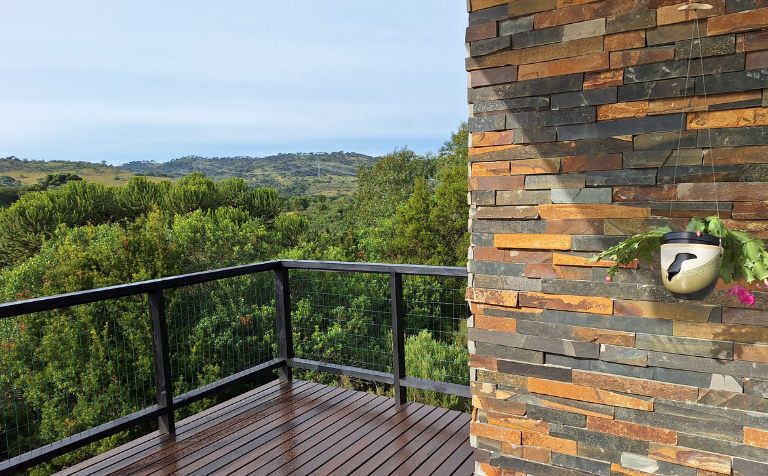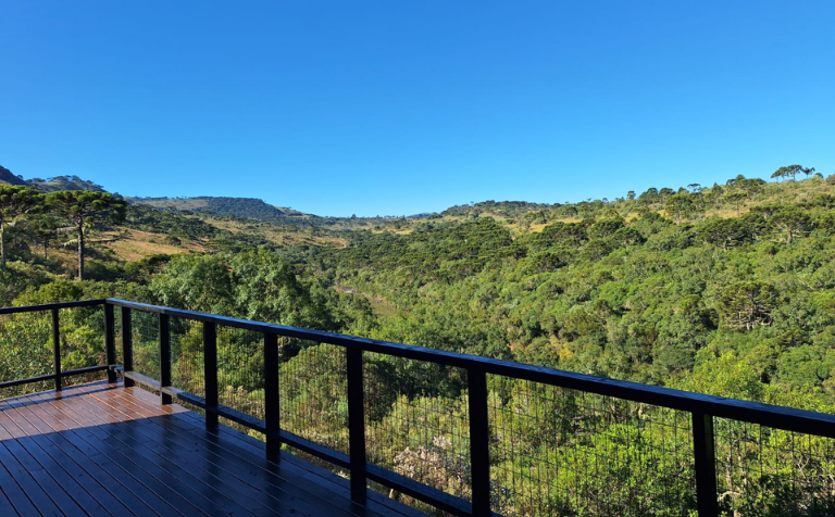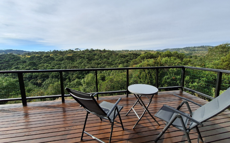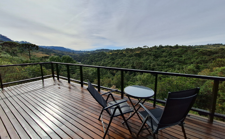 - Amplo deck, à altura das copas das árvores, com vista para o vale do Lava Tudo, com confortáveis cadeiras espreguiçadeiras para você relaxar e apreciar a paisagem ao som das corredeiras do rio tomando um bom “vinho de altitude”.