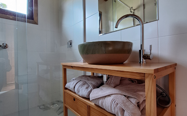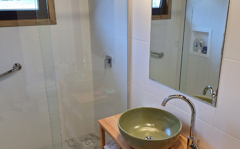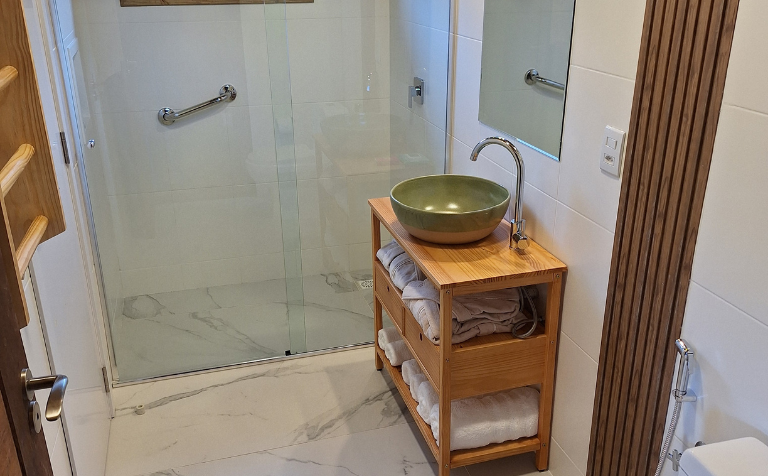- Confortável banheiro privativo com 4,5 m² com ducha de água quente de aquecedor a gás.